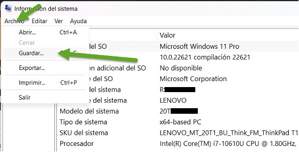 Va a abrir la información del sistema, guardarla con la opción “Archivo” – “Guardar” y envíamelo por favor.